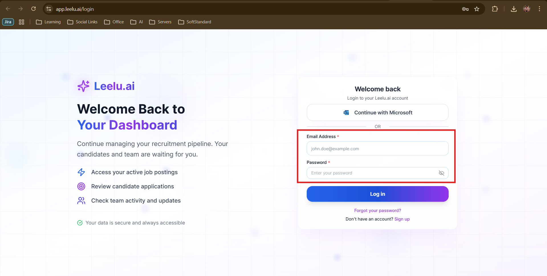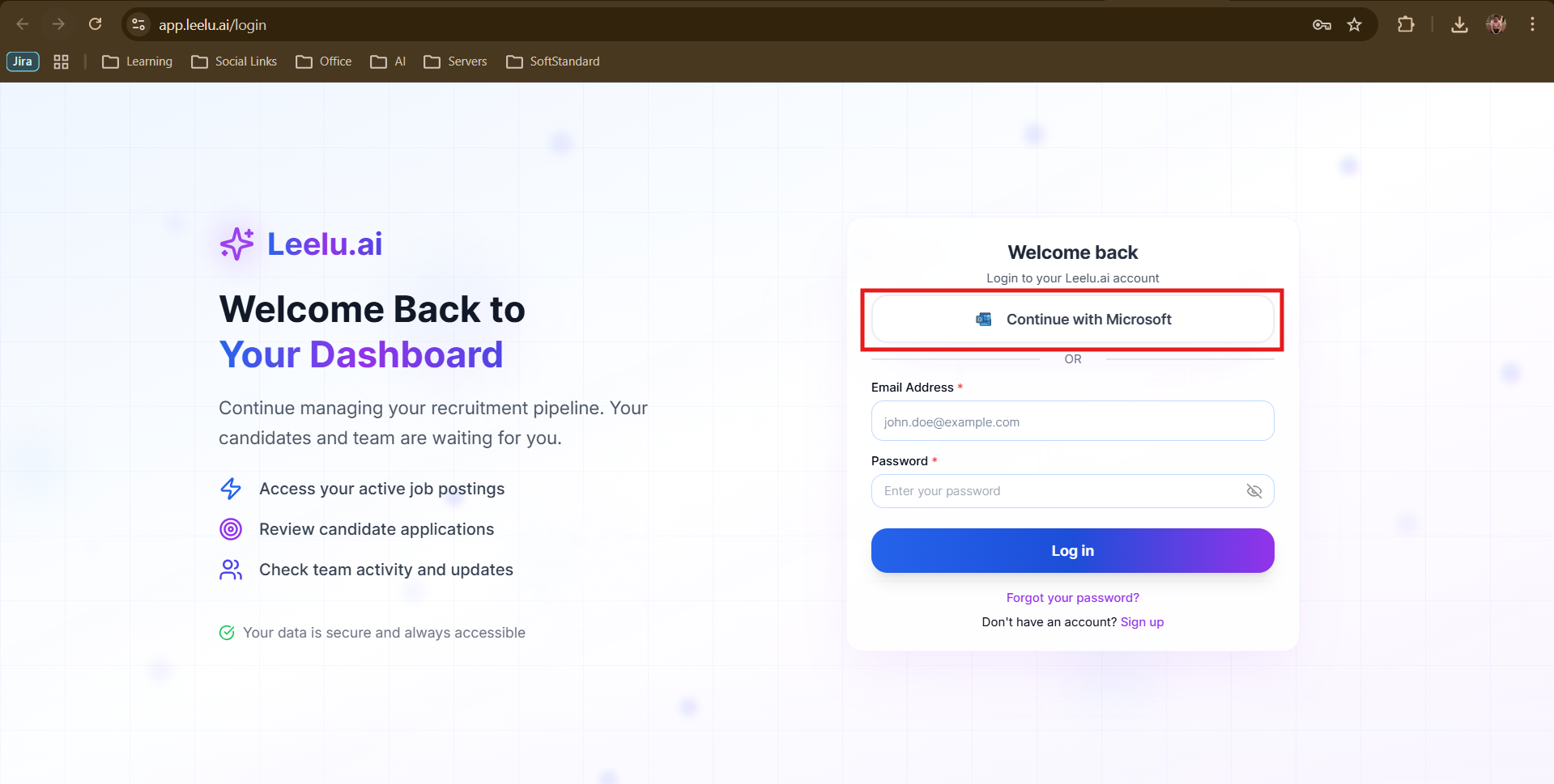 Access your Leelu.ai account quickly using Microsoft Single Sign-On or your email and password.